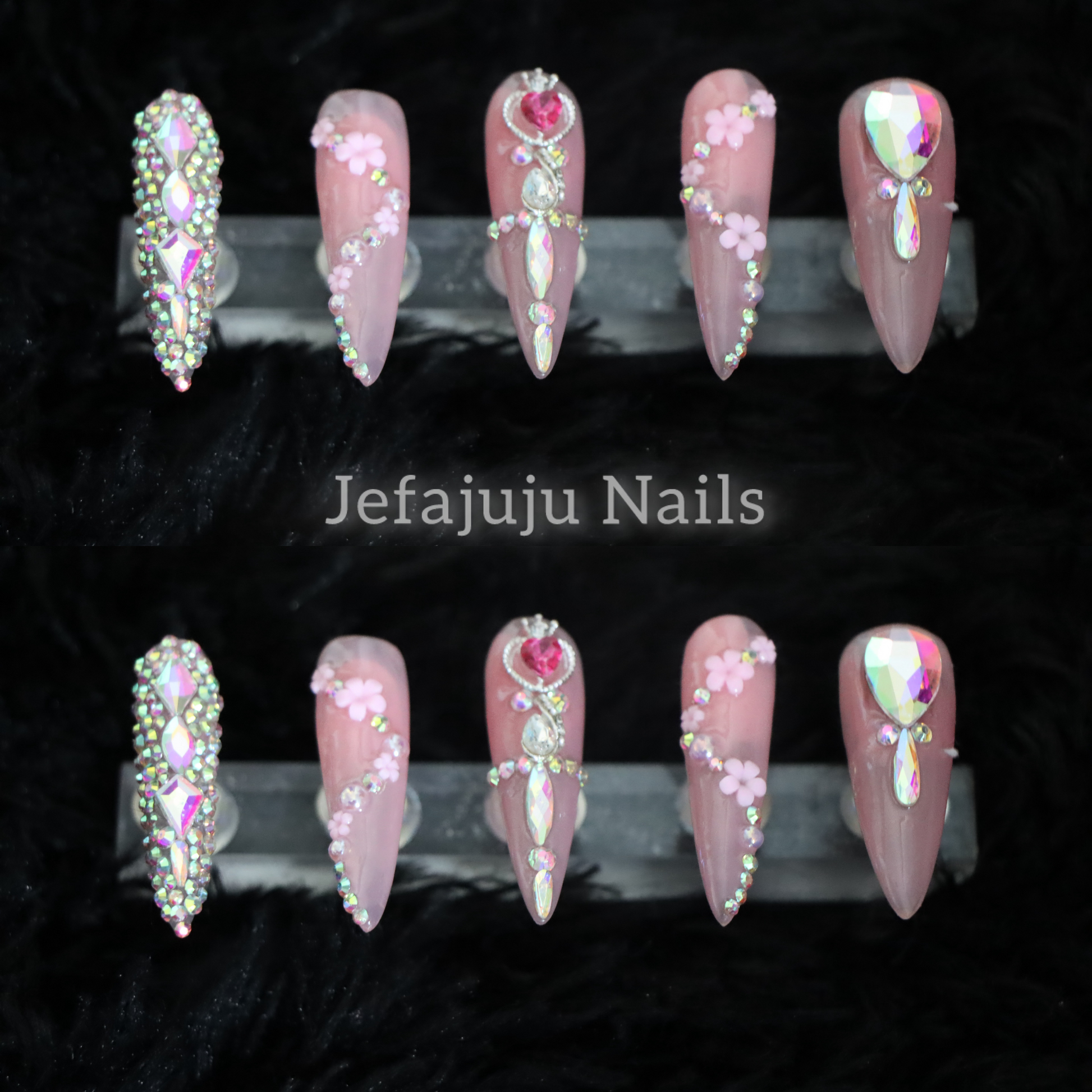 She’s not just cute, she’s collectible. This XL pink fantasy set is giving soft girl with a dangerous sparkle. Designed with a perfect nude-pink base, layered in shimmer, crystal-cut rhinestones, and 3D floral charms, this set is dripping in high-feminine energy.